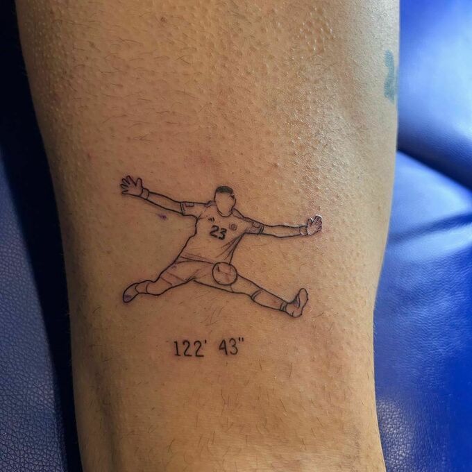 На одной из татуировок он изобразил свою футболку в сборной, на другой – кубок мира, а на третьей – легендарный сейв Эмилиано Мартинеса на 123-й минуте финала между Францией и Аргентины, который позволил аргентинской команде перевести игру в серию послематчевых пенальти и вскоре завоевать трофей.
