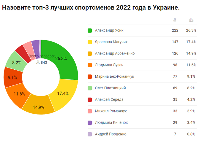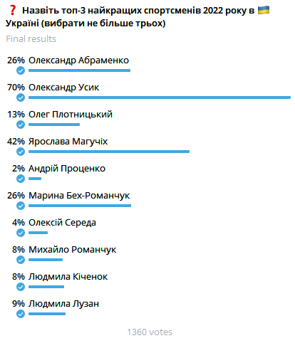С 29 декабря по 7 января все читатели Sport.ua имели возможность проголосовать за лучшего спортсмена 2022 года. Всего в опросе было отдано 843 голоса на сайте и 1360 голосов в Telegram.