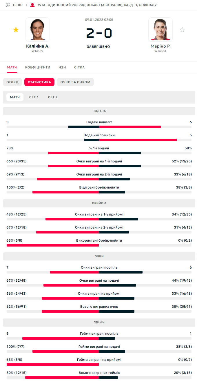Ангелина Калинина (Украина) [5] – Ребекка Марино (Канада) – 6:2, 6:1