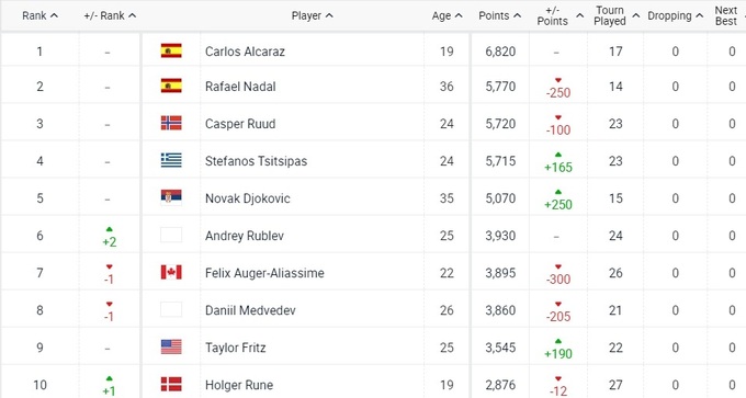 В топ-10 вернулся Хольгер Руне, также во второй части первой десятки состоялись небольшие изменения.