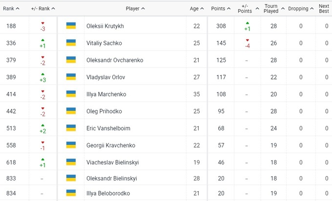 Украинцы в первой тысяче рейтинга ATP