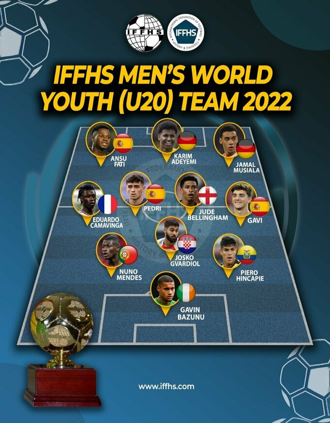 Международная федерация футбольной истории и статистики IFFHS назвала символическую сборную U-20 по итогам 2022 года.