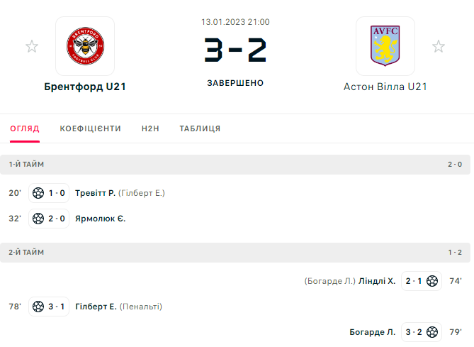 Ярмолюк забил гол за молодежку Брентфорда U-21 в ворота Астон Виллы U-21