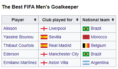 Кандидаты: Алиссон, Яссин Буну, Тибо Куртуа, Эдерсон, Эмилиано Мартинес