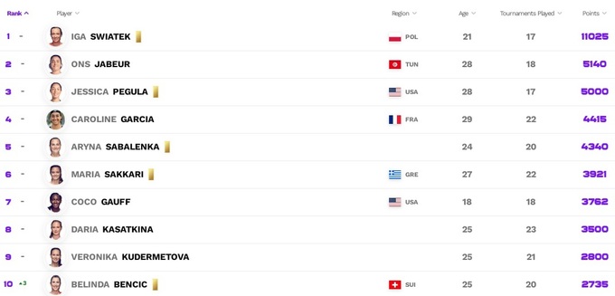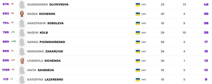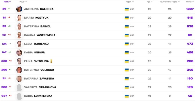 У украинок изменения небольшие. Ангелина Калинина поднялась на одну позицию, Марта Костюк опустилась на четыре. Катерина Байндл и Дарья Снигур немного улучшили свое положение, Даяна Ястремская покинула первую сотню.