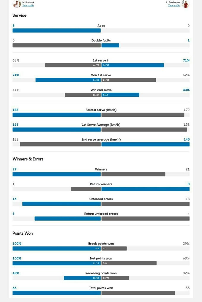 В восьмом гейме Костюк отдала свою подачу, но затем снова сделала брейк и спокойно подала на матч.