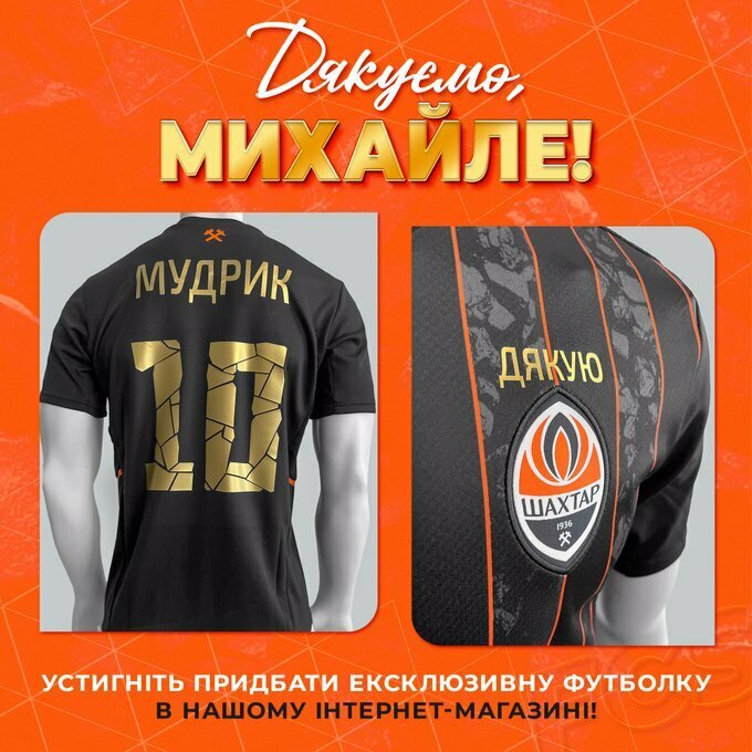 «Шахтер» сообщил о том, что представил для продажи эксклюзивные футболки с благодарностью полузащитнику Михаилу Мудрику, который в воскресенье перебрался в «Челси» за 100 миллионов евро.