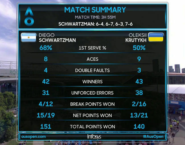 В матче первого круга Открытого чемпионата Австралии по теннису украинец Алексей Крутых проиграл Диего Шварцману из Аргентины.