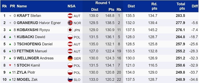 Крафт опередил норвежца Халвора Эгнера Гранеруда и вчерашнего победителя, Рёю Кобаяси. Лидер Кубка мира, Давид Кубацки, стал четвертым.