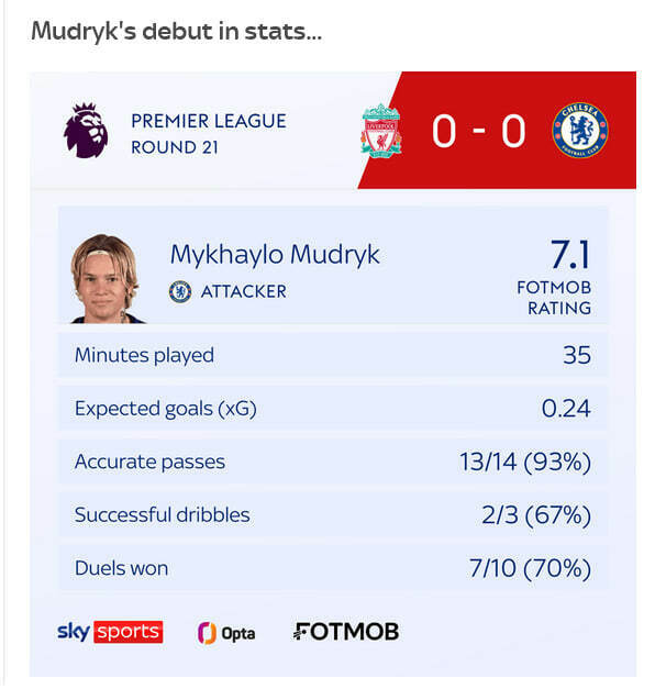 Хавбек «Челси» Михаил Мудрик дебютировал в чемпионате Англии, выйдя на замену в игре с «Ливерпулем» (0:0). Украинский игрок оставил о себе хорошее впечатление.