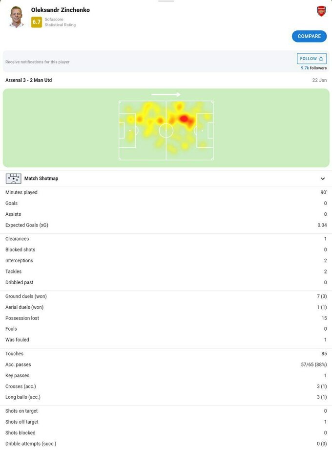Зинченко совершил 2 отбора, один раз пробил по воротам и имел 88% точности передач.