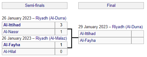 Финал четырех проходит в саудовском Эр-Рияде. В матче за трофей 29 января «Аль-Иттихад» сыграет против «Аль-Фейха», который в другом полуфинале обыграл «Аль-Хиляль» (1:0).