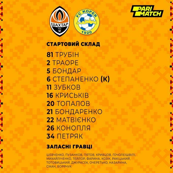 Шахтер: Трубин, Конопля, Матвиенко, Бондарь, Степаненко, Бондаренко, Крыськив, Зубков, Топалов, Петряк, Траоре