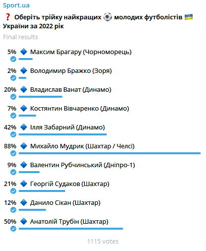 В этом году победитель был определен с помощью опроса читателей в Telegram-канале Sport.ua. В голосовании приняло участие 1115 респондентов, которые выбирали топ-тройку на свое усмотрение.
