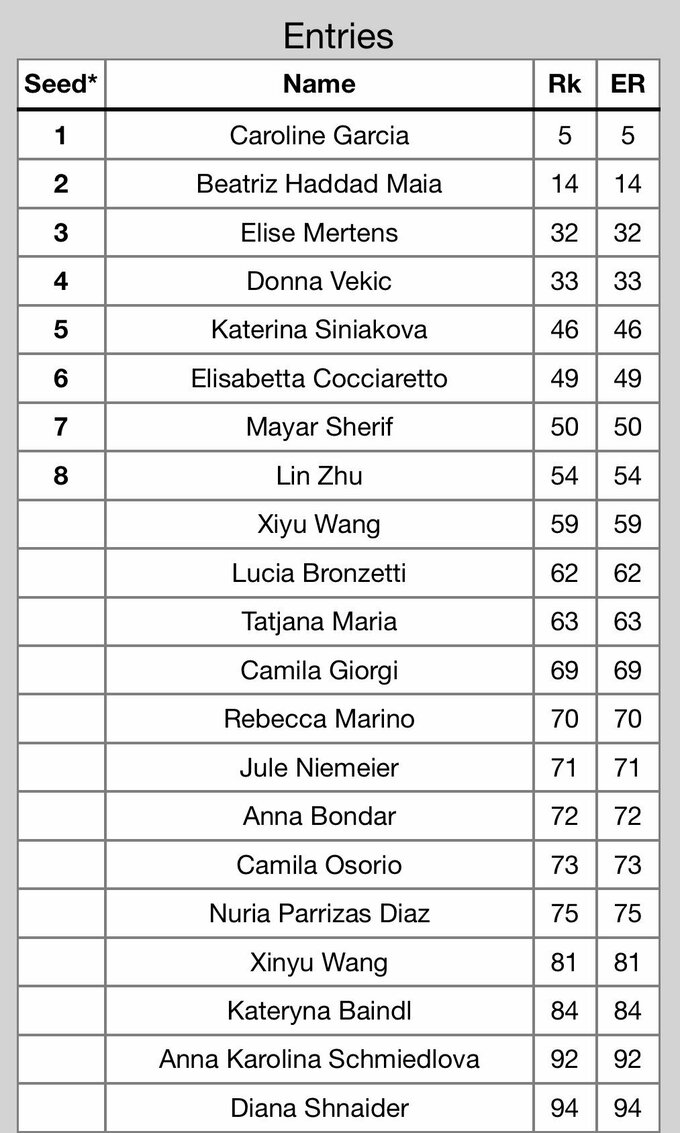 Посев возглавит пятая ракетка мира Каролин Гарсия из Франции. Из топ-20 планирует сыграть и Беатрис Хаддад-Майя из Бразилии, также в списке Элизе Мертенс и Донна Векич.
