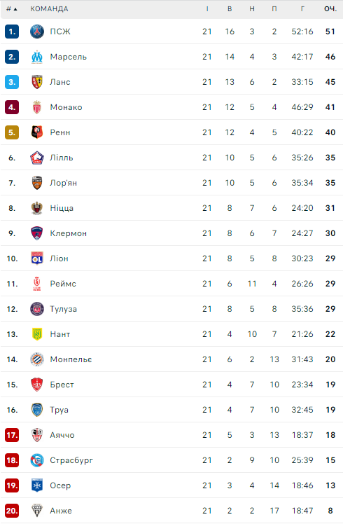 Сейчас на первом месте после 21-го тура в таблице Лиги 1 идет «ПСЖ», имея в своем активе 51 очко. На втором месте расположился «Марсель», который обыграл «Нант». У него 46 очков. Тройку замкнул «Ланс» с 45 очками – он проиграл «Ницце».