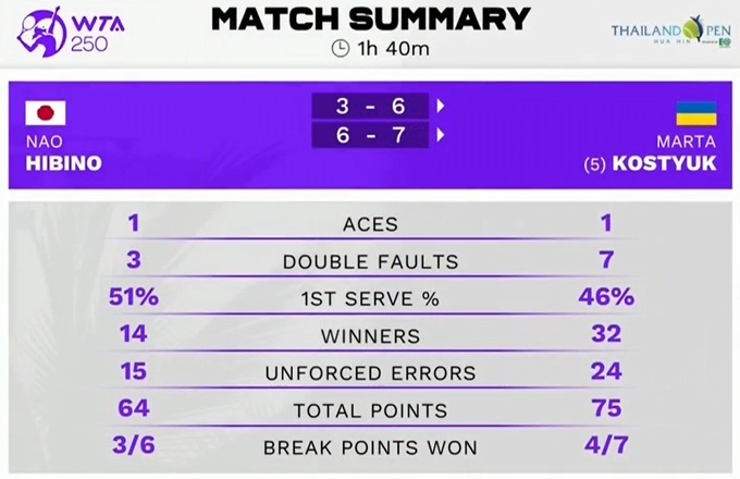 Марта Костюк (Украина) – Нао Хибино (Япония) – 6:3, 7:6(7)
