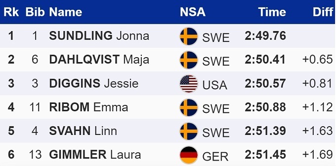 У женщин свою вторую победу в сезоне одержала шведка Йонна Сундлинг, которая опередила партнершу по команде Майю Дальквист и американку Джессику Диггинс.