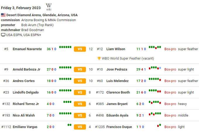 Мексиканец Эмануэль Наваррете (36–1, 30 КО) выйдет на ринг против австралийца Лиама Уилсона (11–1, 7 КО).