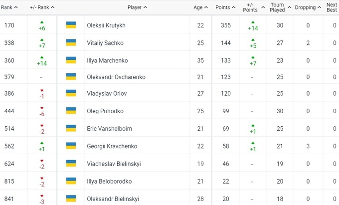 Тройка лучших украинских теннисистов синхронно улучшила свое положение в рейтинге. Алексей Крутых продолжает обновлять личные рекорды, он уже 170-й. Виталий Сачко и Илья Марченко также в плюсе, хотя есть куда стремиться. У остальных ситуация мало изменилась.