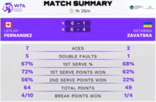 Будемо відверті: Завацька не в змозі грати з суперницями рівня Фернандес, якщо ті в нормальних кондиціях. Її рівень це ITF, максимум, челенджери. Але все одно молодець, боролася до останнього.