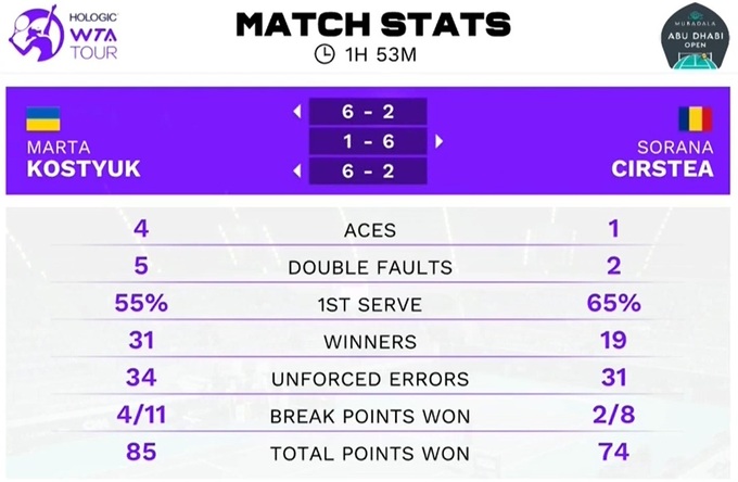 Украинская теннисистка Марта Костюк (№57 WTA) с победы начала выступления на турнире WTA 500 в Абу-Даби.