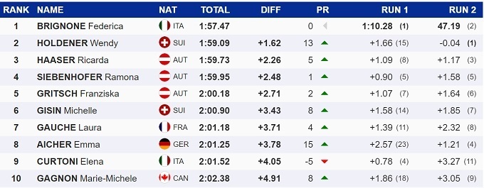 Золото завоевала итальянка Федерика Бриньоне, которая выиграла попытку в супергиганте и показала второе время слалома. Она опередила 2-кратную чемпионку мира в этом виде, швейцарку Венди Холденер, и австрийку Рикарду Хаазер.