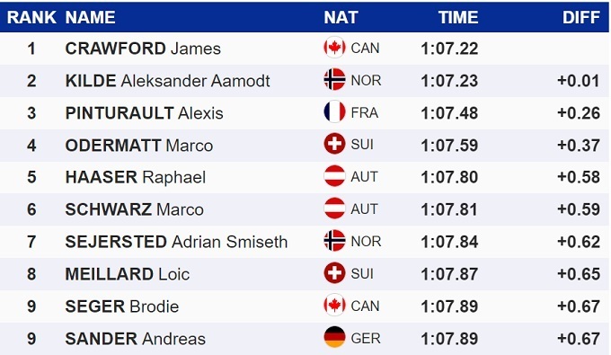 Канадский горнолыжник Джеймс Кроуфорд сенсационно завоевал золото чемпионата мира 2023 года в супергиганте. Он всего на 0,01 секунды опередил норвежца Александера Омодта Килде. Бронзу завоевал свежеиспеченный чемпион мира в комбинации, хозяин чемпионата, Алексис Пинтуро из Франции. Лидер Кубка мира, швейцарец Марко Одерматт, остался без медали – четвертое место.