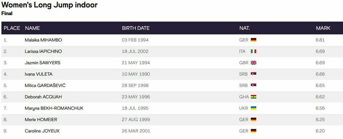 Украинка показала результат 6.56 метров. Выиграла турнир немецкая спортсменка Малайка Михамбо, которая прыгнула на 6,81 метр.