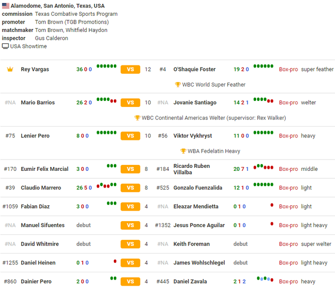 В главном поединке вечера будет разыгран вакантный титул чемпиона мира по версии WBC во втором полулегком весе. Его оспорят мексиканец Рей Варгас и американец О'Шаки Фостер.