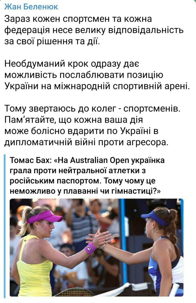 Олимпийский чемпион и народный депутат Жан Беленюк в своем Telegram-канале косвенно наехал на украинскую теннисистку Катерину Байндл, которая после матча с представительницей рф на Открытом чемпионате Австралии пожала ей руку: