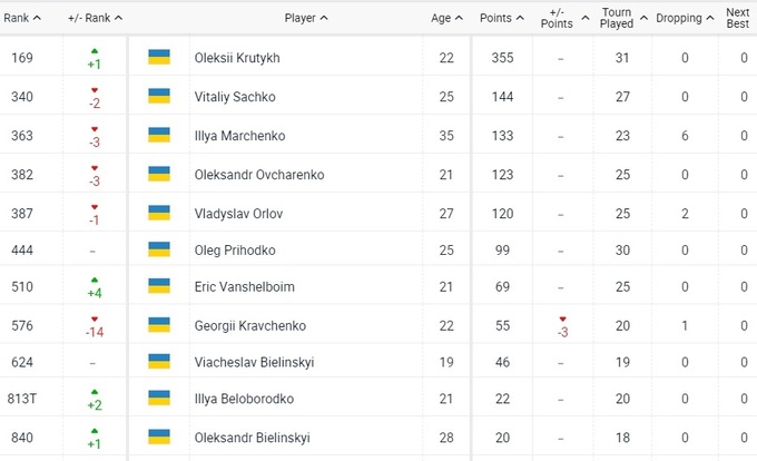 Украинцы в первой тысяче рейтинга ATP
