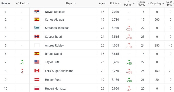 В первой десятке состоялось одно изменение: Тейлор Фритц обошел Феликса Оже-Альяссима, обновив личный рекорд.