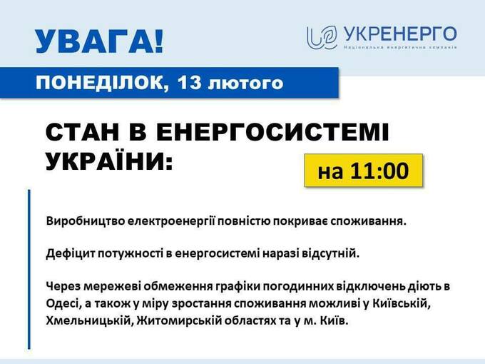 В «Укрэнерго» сообщили, что почасовые отключения электроэнергии пока остаются в силе только в Одессе, также они возможны в Киевской, Хмельницкой, Житомирской областях и в Киеве.