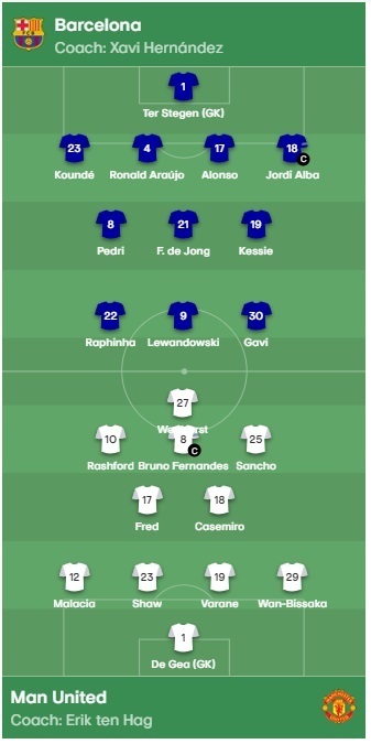 «Барселона»: тер Стеген – Кунде, Араухо, Алонсо, Альба – Педри, Френки де Йонг, Кессье – Рафинья, Левандовски, Гави