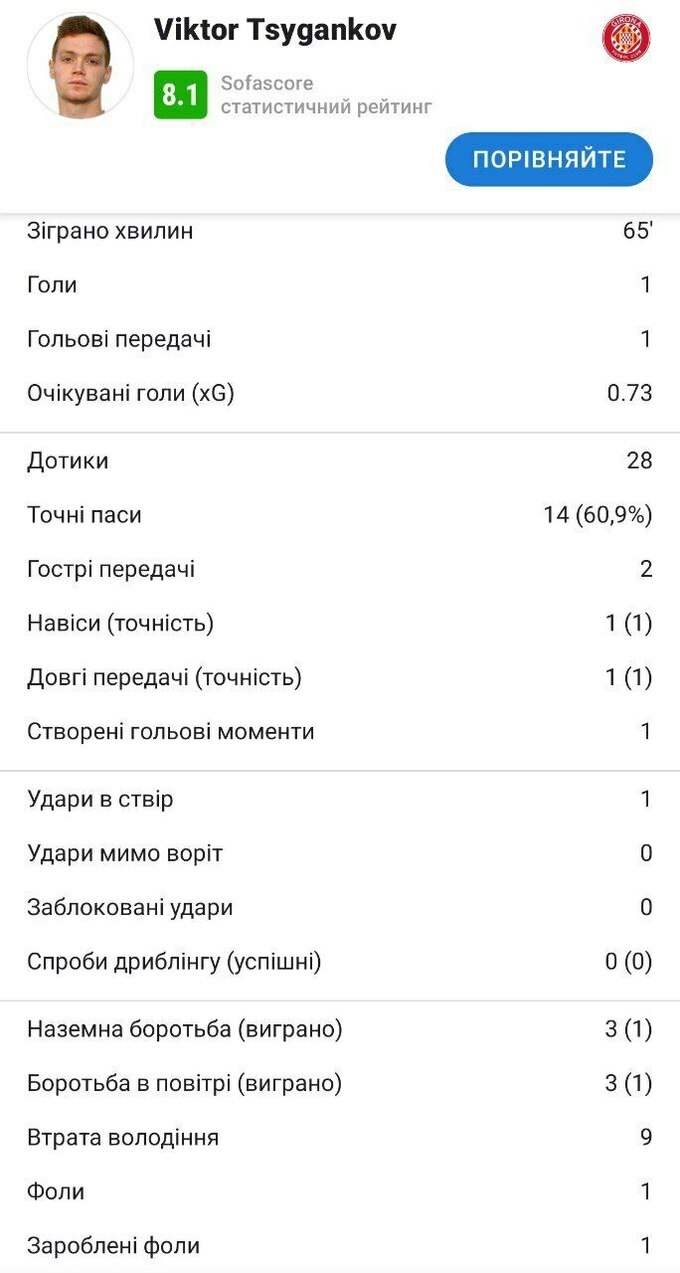 За матч, помимо гола и голевой передачи, украинец сделал 28 касаний мяча, отдал 14 точных передач, из которых 2 ключевые, выиграл 1 верховую дуэль из 3, заработал 1 фол и заблокировал 1 удар соперника.