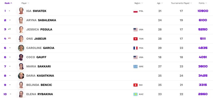 Впервые в текущем сезоне сайт WTA показал ситуацию в Чемпионской гонке WTA.