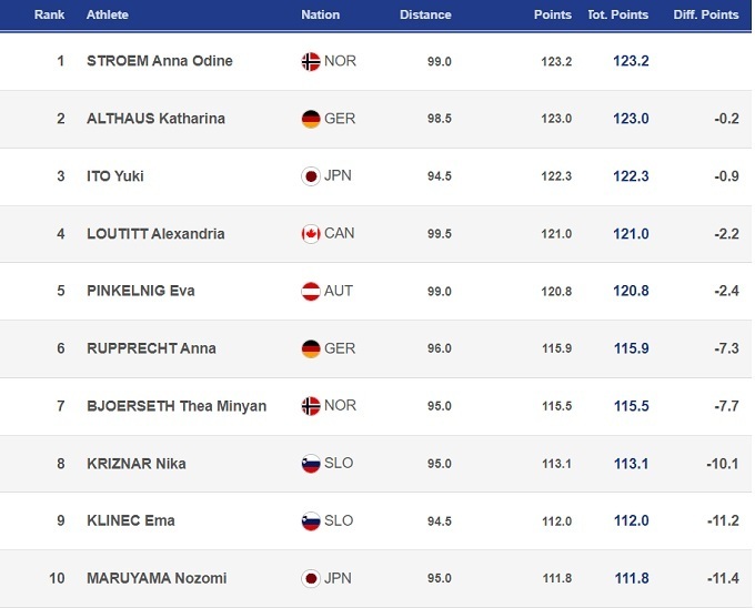 Выиграла квалификационную попытку норвежка Анна Один Стрём, которая опередила немку Катарину Альтхаус и японку Юки Ито.