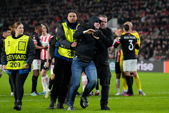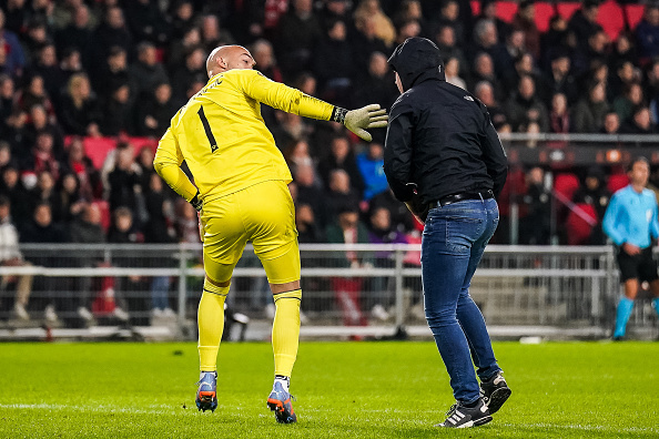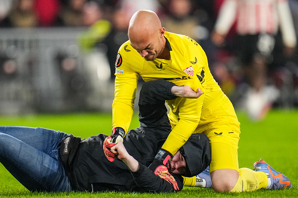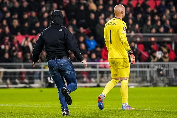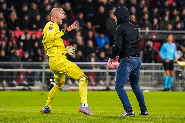 At full time of Sevilla eliminating PSV from the Europa League, a fan ran on to the field to attack Sevilla keeper Marko Dmitrović.