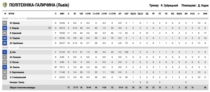 «Политехника-Галичина»: Новиков 19 + 5 подборов + 2 передачи, Заплотинский 15 + 9 подборов + 4 передачи + 3 перехвата + 3 блок-шота, Кингсби 17, Дубоненко 13 + 4 передачи, Мусиенко 13 — старт, Кошеватский 5, Юрченко 2, Дюпин 0, Фреш-Стаханов 0