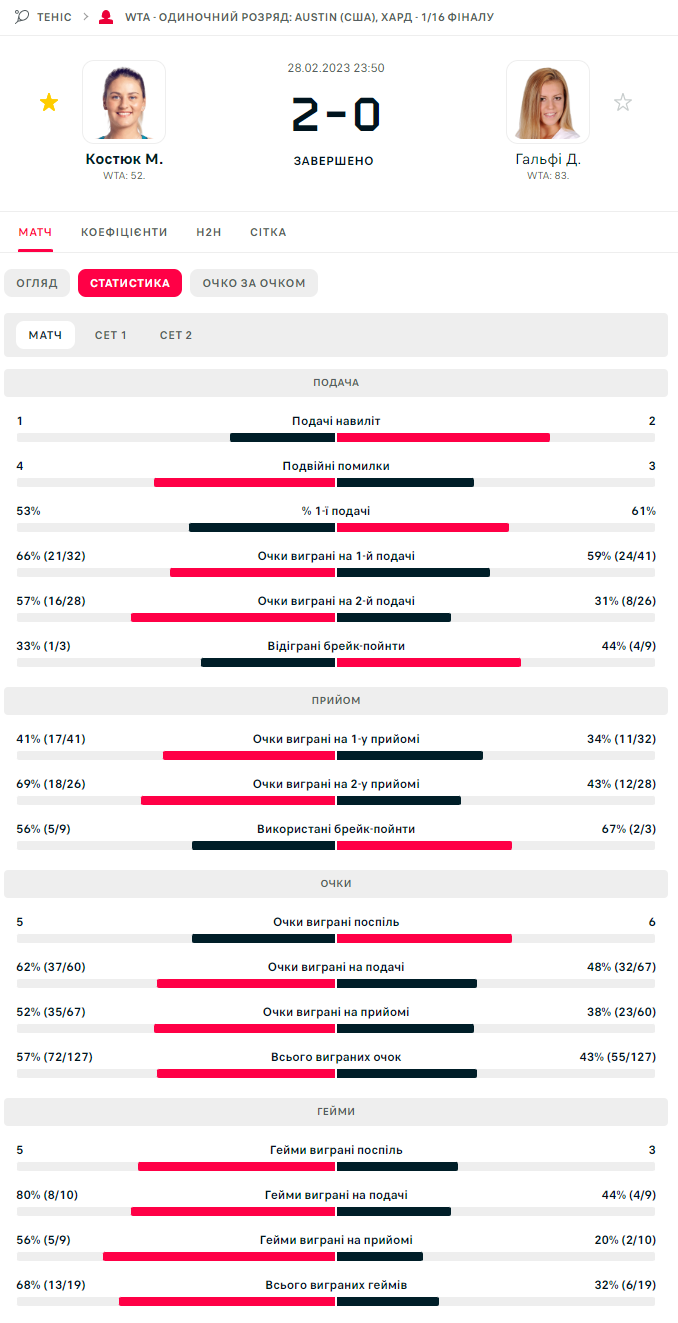 Костюк победила соперницу в двух сетах. Матч длился 1 час 24 минуты.