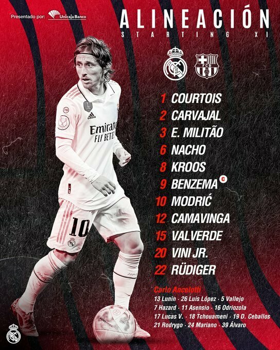 «Реал»: Куртуа, Карвахаль, Милитао, Начо, Рюдигер, Модрич, Камавинга, Вальверде, Кроос, Винисиус Жуниор, Бензема