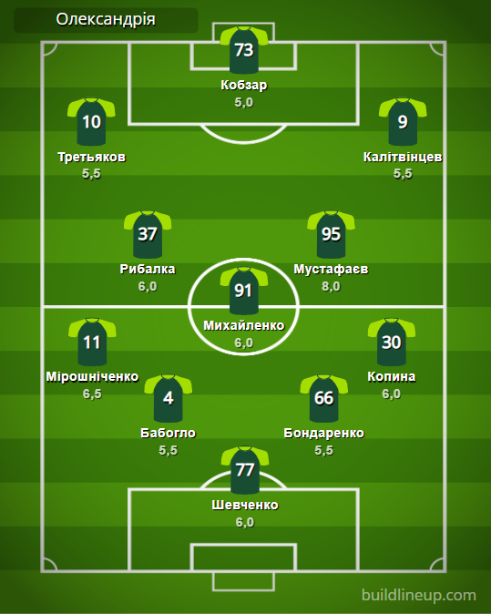 «Александрия»: Шевченко – Мирошниченко, Бабогло, Бондаренко, Копина (Цуриков, 69) – Рыбалка (Сигеев, 82), Михайленко (Ковалец, 68), Мустафаев – Третьяков, Кобзарь (Кожушко, 56), Калитвинцев (Кулаков, 69).