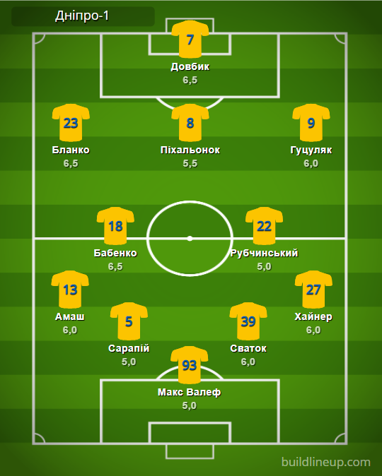 «Днепр-1»: Макс Валеф – Амаш, Сарапий, Сваток, Хайнер – Бабенко, Рубчинский (Когут, 46) – Бланко (Назаренко, 82), Пихалонок, Гуцуляк – Довбик (Пидлепенец, 80).