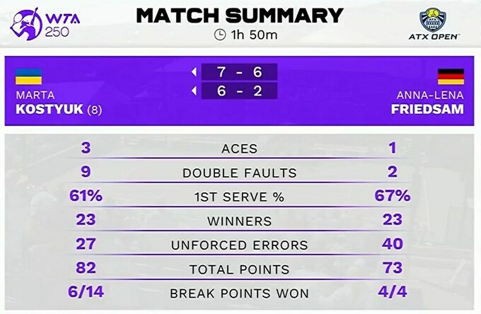 Марта Костюк (Украина) – Анна-Лена Фридзам (Германия) – 7:6 (8:6), 6:2