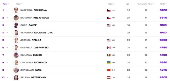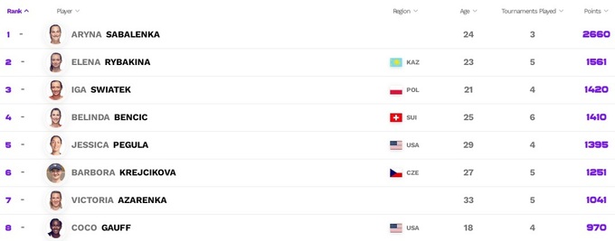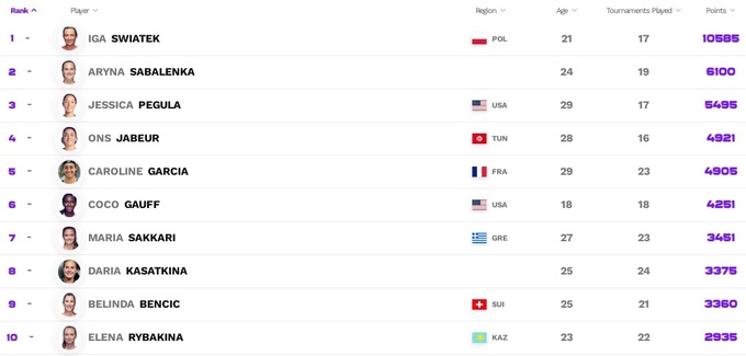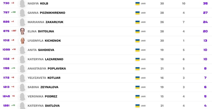 Среди лидеров Чемпионской гонки ничего не поменялось, но финалистки и победительницы соревнований прошлой недели неплохо подтянулись. Гарсия и Векич – десятая и одиннадцатая, Марта Костюк – тринадцатая.