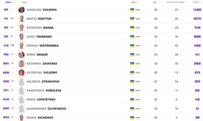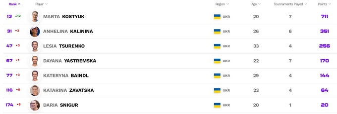Ангелина Калинина хоть и не играла, но сумела сохранить место в тридцатке сильнейших. Катерина Байндл и Леся Цуренко немного улучшили свои позиции. Даяна Ястремская потеряла очки за прошлогодний финал в Лионе и опустилась на 142-ю строчку. Анна Познихиренко спрогрессировала почти на две сотни мест.