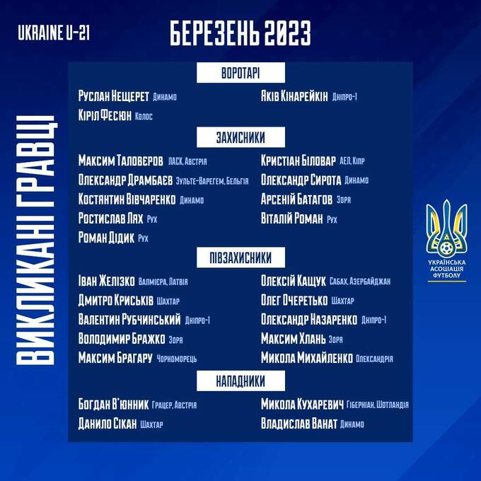 Главный тренер молодежной сборной Украины Руслан Ротань объявил список из 26-ти игроков, вызванных на мартовский сбор для подготовки к финальному турниру Евро-2023 (U-21).