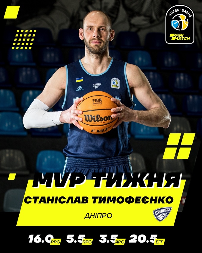 Станислав Тимофеенко (Днепр, 4 матча - 4 победы) - 16.0 очка, 5.5 подбора, 3.5 передачи, 1.5 перехвата (РЭ 20.5)