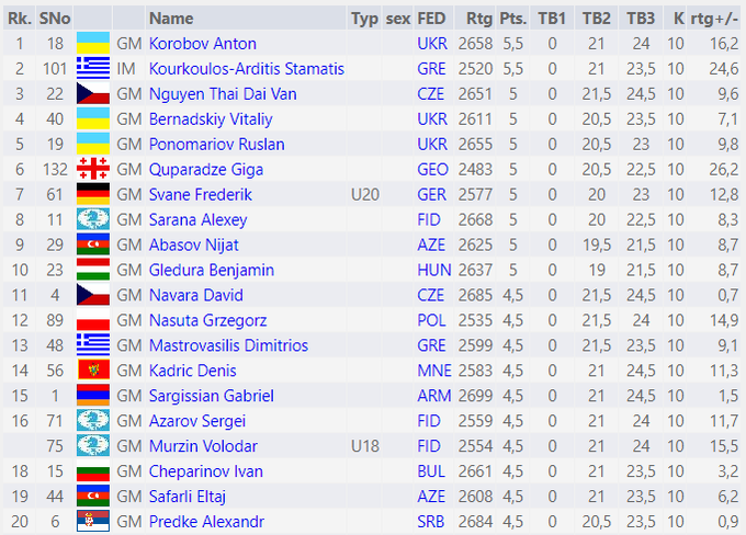 Чемпионат Европы 2023 по шахматам. Турнирное положение после 6 туров